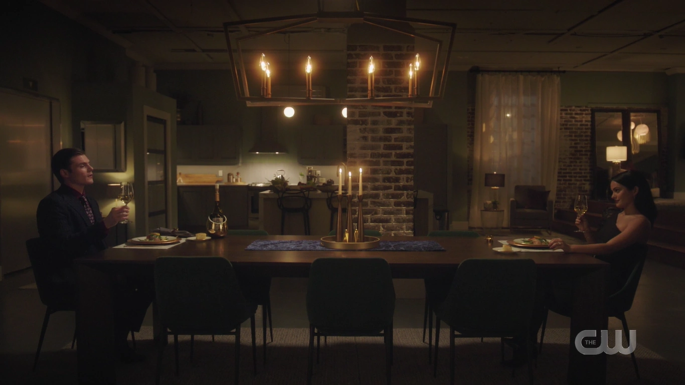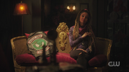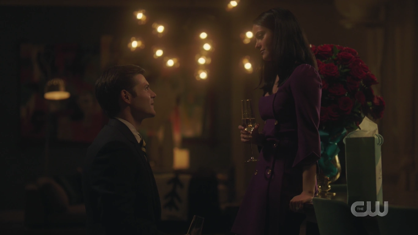 Veronica arrives home to find Chad and a bouquet of flowers waiting for her. He apologizes for the fight. Chad explains that when their helicopter went down on the way to Martha’s Vineyard, he said a prayer, hoping that Veronica would at least survive the crash. And then they both survived, and he realized that there was so much that they hadn’t gotten to do. Veronica understands his perspective, but she reminds him that they’re partners and that she’s fully capable of making her own decisions, which she hopes Chad will have faith in. As an apology gift, Chad gives Veronica a Glamerge egg, informing her that a new one comes out each year. The very next day, Veronica sells the egg to a couple at Gilmore before getting a call from Archie to return to Riverdale.