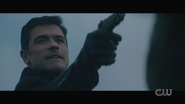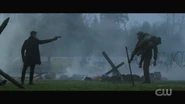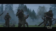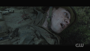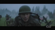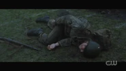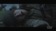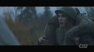 Archie dreams that he’s back home in Riverdale, specifically the boys locker room at Riverdale High, giving a pep talk to the Bulldogs before the big game. He tells Reggie and his other teammates that Bulldogs never give up. General Taylor approaches and explains that their mission is to penetrate the enemy’s defenses, retrieve their fallen brother, and return safely to base. And within a moment’s notice, Archie, now dressed in military gear and armed with a rifle, storms the field with the Bulldogs, dodging gunfire and explosions. Archie is then knocked to the ground. He looks up and briefly sees Cheryl and the River Vixens cheering them on. Archie gets back to his feet and retrieves Jughead, who lays wounded on the ground. Not too far off, Betty, Veronica, Kevin, Fangs, Sweet Pea, and Pop Tate flag Archie down, calling him over. However, with Jughead draped over his shoulders, Archie finds himself defenseless at the end of Hiram’s gun, who then proceeds to pull the trigger.