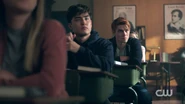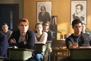 At school, the gang meet up, where Archie, Betty and Veronica learn from Jughead that Pop Tate's entire staff quit on him. To make matters worse, he isn't sure how much longer he'll be able to keep the diner doors open. Archie then points out that the diner's closing is a result of his father's shooting, so People are bound to be scared, not that he blames them as he too is actively avoiding the diner. Betty is baffled by what she is hearing; her friends accepting the fact that Pop's is closing. She cannot allow one psychopath with a gun dictate what happens to their favorite hangout place. Pop's is a major part of their lives, and where many important memories are rooted. She reminds Jughead of his crusade to save the Twilight Drive-In when it was closing, though with his father's hearing approaching, he doesn't have it in him to take on any further social issues, which is why Betty and Veronica decide to team up once again and volunteer to take point on helping Pop Tate. Jughead then announces that he has to leave as he has to meet with his father's court-appointed lawyer, who is far from qualified for the task. Archie decides to join him as he too has business at the Sheriff Station; he needs to drop some flyers off regarding the black hooded assailant.