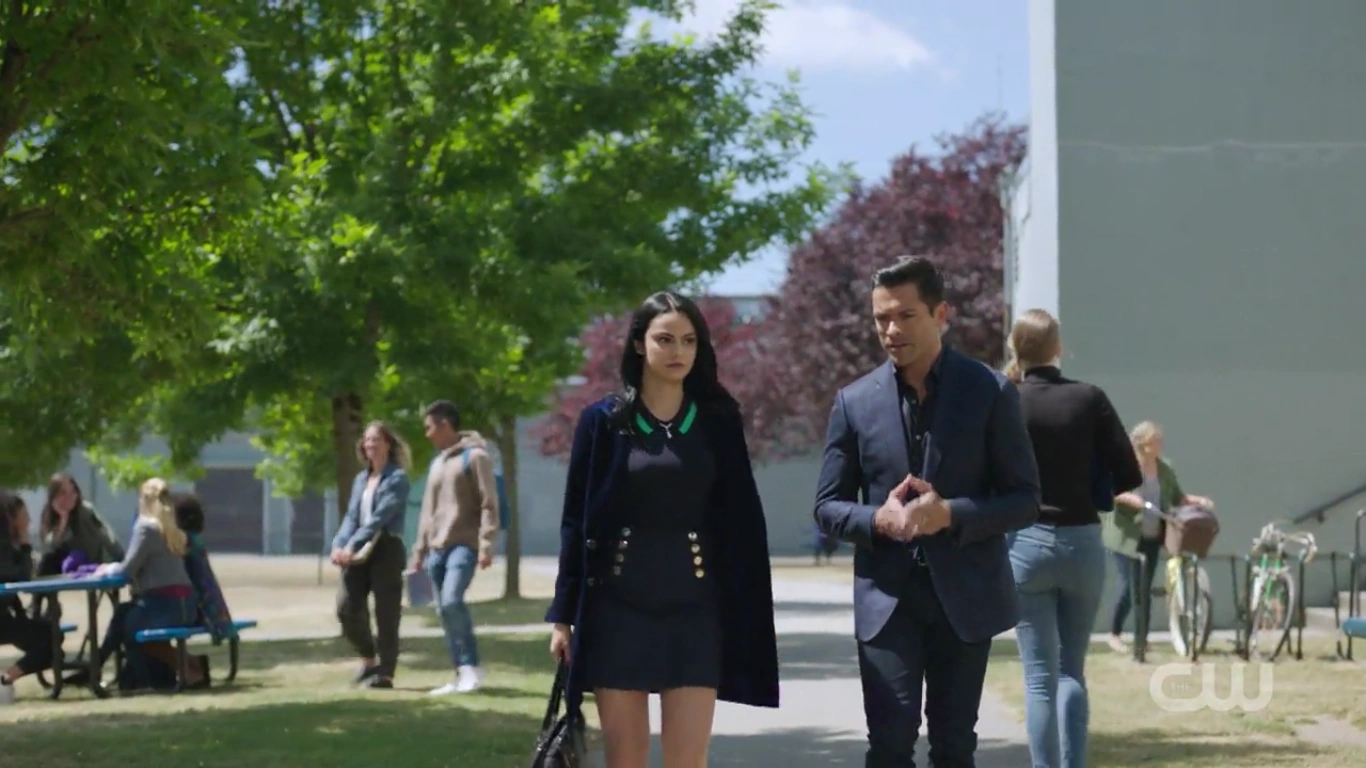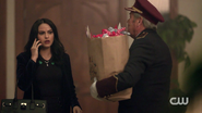 Just outside the school, Hiram explains that every day he was in prison, he thought about getting back to Veronica and Hermione. And while he knew it wouldn't be easy, and knew it would take time, he was hoping that Veronica could at least meet him halfway. It's not that she didn't want to meet him halfway or that she didn't want everything to go back to the way it was, but as Veronica put it, the blindfold's off, and she can't just put it back on and ignore all his wrongdoings. Hiram's arrest and the events that followed resulted in Veronica seeing him in a whole new light. She apologizes for not being able to give him the answer he desires, but she needed to get back to her friends. Before she does so, Hiram offers to help with her crusade to save Pop's Chock'lit Shoppe from closing in any way he could, though she didn't seem interested in his help.