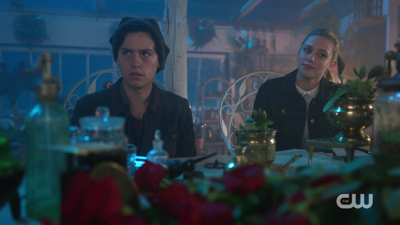 Alice is taken by surprise when three members of the Southside Serpents show up in the diner, during which time she took several photos of them with her phone. And while they didn't cause any trouble, some were uneasy with their presence, such as Betty, who also notices their arrival, though Jughead tells her to relax, as he was sure that they were simply there to enjoy Pop's world-class burgers and service. Betty and Jughead then began to kiss before being interrupted by Cheryl, who compared the couple to chimps in captivity, grooming and picking lice off each other. Mark this day in your diary, Cheryl say. She lied under oath for them. Luckily, she was quick on her feet. Jughead thanks Cheryl for her help before handing over the USB flash drive containing video surveillance of her brother's murder, though Betty honoring her end of their deal was all the thanks Cheryl needs.