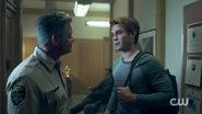 Despite previously telling his father and Mrs. Cooper that they were right about the incidents being unrelated, Archie went down the Sheriff station to inform Sheriff Keller that he had a suspect in the attacks. He thinks that it was Ms. Grundy's abusive ex-husband. She moved to Riverdale to get away from him. She kept a gun in her car in case he ever comes back for her. How do you know all this, Sheriff Keller questions. Archie tells him that he and Ms. Grundy were close. He was thinking that her ex-husband found out about him. Furthermore, Ms. Grundy was killed with a cello bow. Archie doesn't believe that it's a coincidence that she was killed by a cello bow after he so happened to give her one before she left Riverdale. He is positive that it's the murder weapon, and that it was a message. Unfortunately, Archie's theory was wrong as Sheriff Keller went on to explain. His counterparts in Greendale had already brought in her ex-husband. And he had an airtight alibi. Hearing this, Archie begins to think that maybe he is going crazy and everyone else was right.