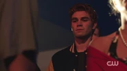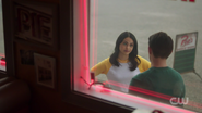 Archie arrives outside of the diner to the sight of Josie and the Pussycats performing. As he enters the shoppe, Veronica greets him with a hug and a kiss after asking if he was okay with being in the diner as it was his first time being back since the shooting. After escorting Archie to his booth, Veronica bumps into her parents, who decided to attend the event as a show of support. With the night being a new beginning for Pop's, Veronica suggests that maybe the night can be a new beginning for them as well. However, she asks for total transparency in return. In the spirit of that, Hiram proposes that Lodge Industries make a "charitable contribution" to the diner.