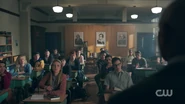 Mr. Weatherbee enters the classroom with tragic news to share. He reveals to the students that Ms. Grundy was found murdered in her Greendale home the prior night. With some of them being students of hers, like Archie Andrews, he could imagine that the news would be difficult to process. Archie, who is overwhelmed with pain and fear, suddenly gets out his seat and exits the classroom.