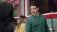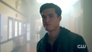 Reggie is approached at his locker by Midge Klump, who is in need of scoring a new drug making its way through Riverdale - Jingle Jangle. She tells Reggie that it's herself as well as her boyfriend, Moose. Reggie instructs Midge to lower her voice while on school property as even the slightest mention of the drug could result in serious consequences. He then tells her that he'll see what he can do. Moments later, he spots Archie across the hall, at the guidance counselor's office. Why are you seeking guidance from Ms. Burble, Reggie asks. Archie replies that he isn't. However, Reggie didn't think it would be such a bad idea if Archie did, in fact, seek counsel considering that he looks like, as Reggie puts it "my nuts after football practice". Archie, who is having trouble with staying awake, asks Reggie if he could help with this. Reggie offers him a number of solutions, one of which being Jingle jangle, which Reggie claims is capable of keeping him up for days, in more ways that one. Though, he can't help but wonder why Archie is seeking "uppers", to which Archie explains that he wants to be on high alert until his father's shooter is apprehended.