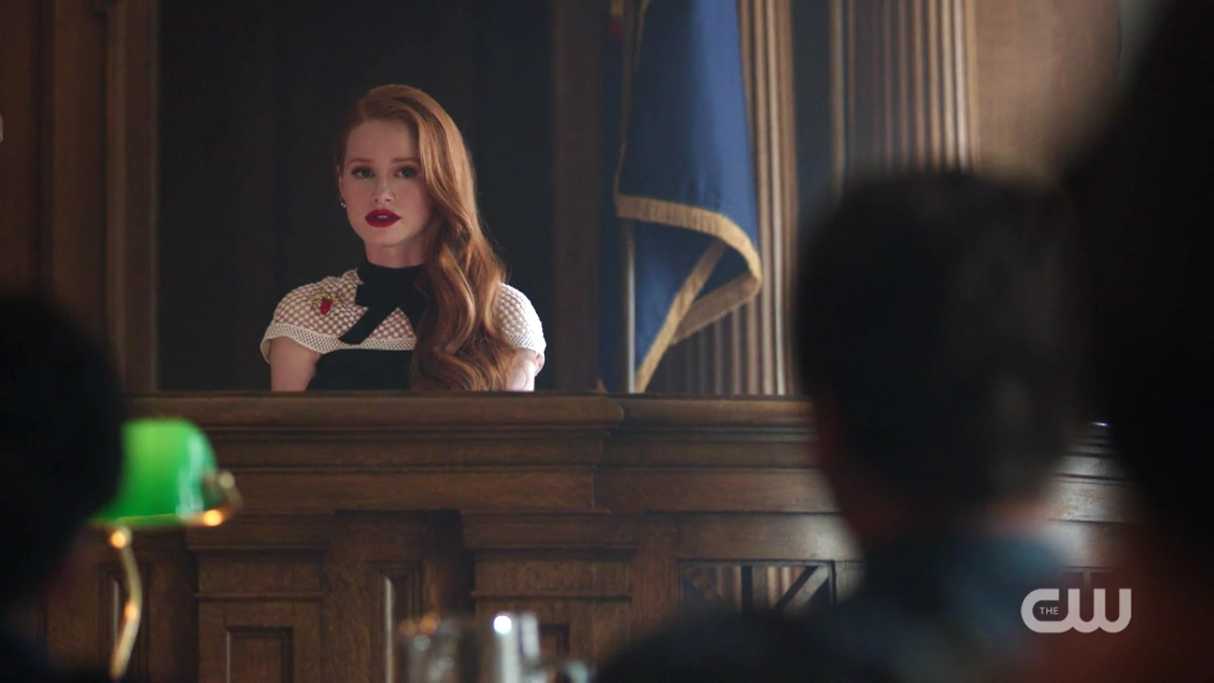 Meanwhile, Cheryl appeared in front of a judge in court, where she testifies on her and her mother's behalf when saying that they forgive FP Jones for the part he played in covering up Jason's murder, and they humbly ask the court for leniency. FP's guilt has been blown out of proportion to satiate what her father's suicide denied them; closure. However, as much as the judge sympathized, he couldn't ignore the quality of FP's crimes. There were no extenuating circumstances on his account. Cheryl blurted out "my father threatened him". Though this is a lie, Cheryl claims to have overheard them talking when she heard her father say he would hurt Jughead if FP didn't comply. Is that extenuating enough, Cheryl asks the judge. In light of these revelations, the judge suggests that they take a step back and reevaluate certain aspects of the case. At which time, they will revisit the sentencing. Thanks to Cheryl, a delay in the case is ordered. Jughead and FP happily embrace one another as Jughead silently sobs after earning their first win in a series of loses.
