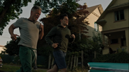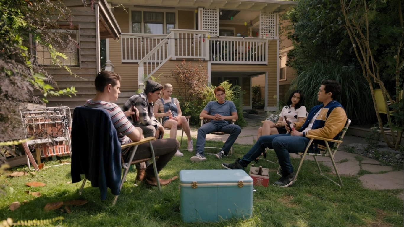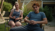 In the backyard, Archie, Veronica, Reggie, Kevin, Jughead, and Betty share their own memories of Fred. Reggie recalls how he broke his arm while playing in the treehouse that Fred had built for him, Archie, and Jughead. Betty remembers the picnic they had in Pickens Park while she and Archie were still in grade school. There was a father-daughter potato sack race. For whatever reason, Betty’s dad couldn’t make it, but Fred offered to do it with her. For that day, he was her dad. When things started to get bad with Jughead’s dad’s drinking, his mom would call up Fred for help, and he would drive to the bar, pick up FP and lay him on the couch. Fred always stayed for a while just to talk and check in on Jughead. Kevin adds that Fred always built and donated all the sets for the musical. Archie remembers going to Sears with him just to ride the tractors. Everything Archie knows is because of his dad, from sports to mechanics. However, reminiscing brings up too many memories for Archie, and so he decides to call it a day.
