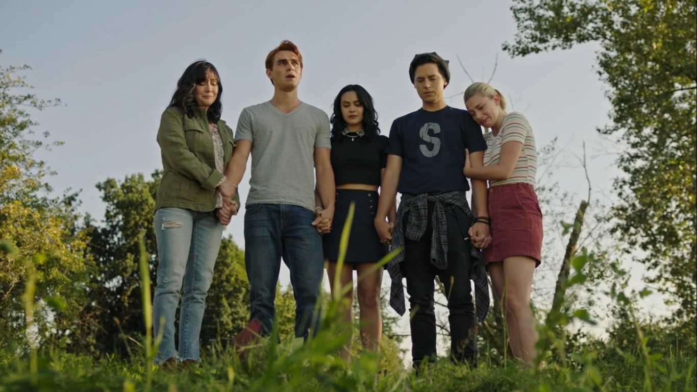 Archie finds his mother looking at old family photos and tells her that it’s time for the fireworks show. Mary and Archie join Betty, Veronica, Jughead, Kevin, Josie, Reggie, Cheryl, and Toni in the backyard as the show begins. Archie imagines if everyone in the world was even half as good as his father was. Veronica says that Archie is, but he disagrees, but that’s how he intends to honor his memory.
