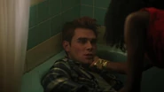 As Josie sings on stage at La Bonne Nuit, Archie drinks his pain away at the bar, with Reggie serving him. Reggie then declines to serve Archie any further as he requests another drink. He does, however, offer to call Archie cab, explaining that Veronica’s dealing with enough as it is, she doesn’t need Archie making a scene. As Archie begins to become unruly, he is roughed up by security, though Josie comes to his rescue, seeing Archie out and taking him home. Josie takes Archie into his bathroom and dumps him in the tub before turning on the cold water as he needs a cold shower.