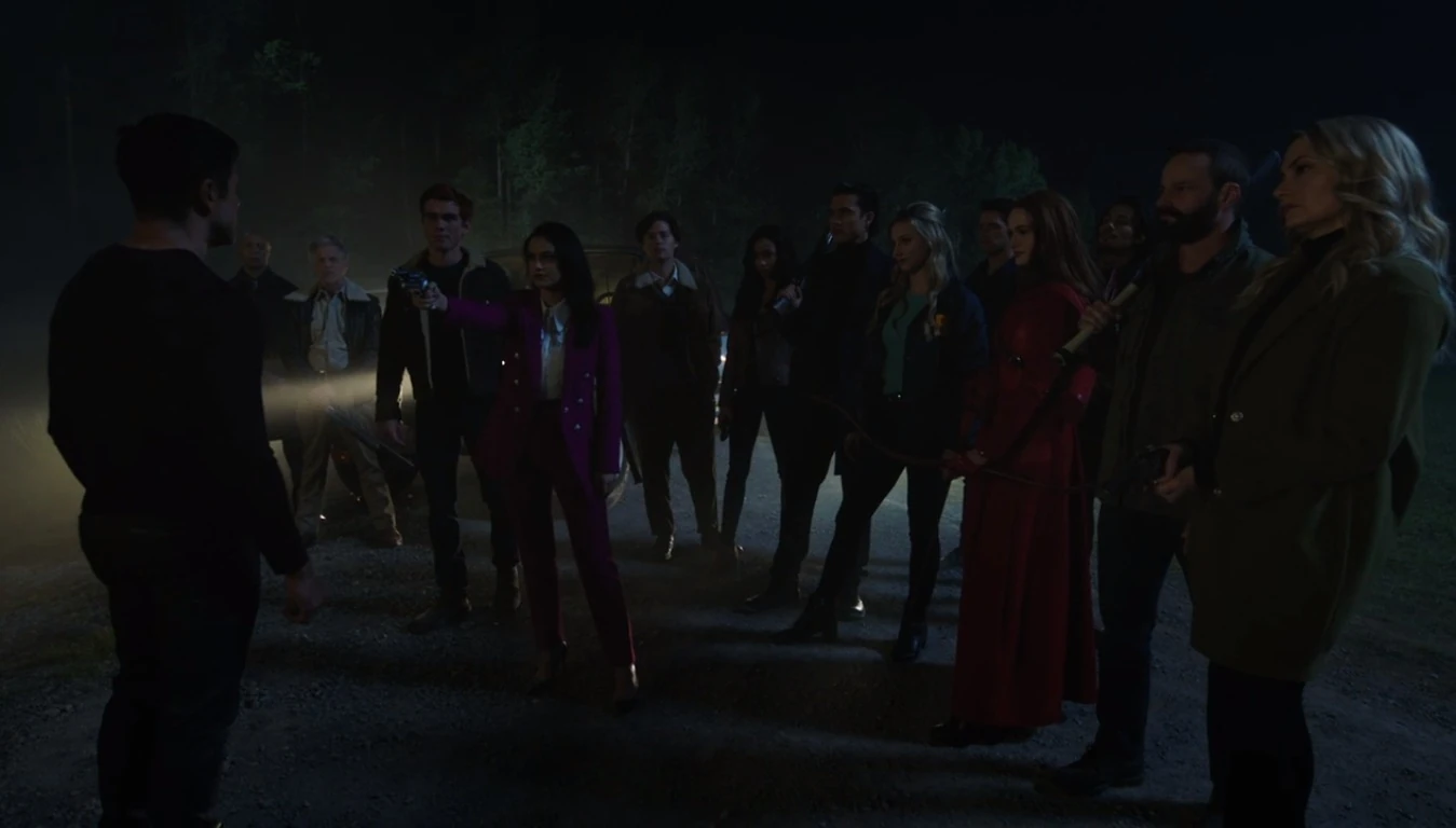 Archie and Veronica have taken Hiram out to the town's border for exile, where the rest of the gang awaits, all armed with various weapons, not the least Cheryl and her bow and arrows. Just on the edge of town, Veronica reveals that they have Hiram on camera as he murdered Vito Alto in his bed, and in exactly one hour, Betty intends to hand the video footage over to the FBI. As for Hiram's belongings, they'll sell whatever he has left in town and use it to rebuild Pop's and Riverdale. Faced with insurmountable odds, Hiram is forced out of Riverdale at gunpoint.