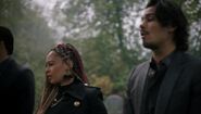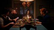Jughead, Tabitha, and Kevin head back to Pop's for drinks after Polly's memorial, in which Alice and Betty buried her ashes.