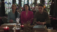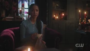 After the funeral, the gang convenes at Thornhill, where they watch the news as Alice comes up with a cover story for those who died in the plague, reporting that they were casualties as a result of the war between the Southside Serpents and Ghoulies. Tabitha suspects this is also why Percival didn't kill every firstborn in town, because it would be too difficult of a task to cover up hundreds, if not thousands of deaths. Regarding Sabrina, Heather explains that she's on her way, but she's quite a busy witch, "Cheerleader by day, Queen of hell by night." Unfortunately, they don't have much time before they miss their opportunity to bring their friends back. Heather elaborates that the resurrection ritual they're attempting must be performed within three days of a person's death, otherwise the body becomes too corrupt to animate, and two days have already passed. Fortunately, Percival suspects nothing and is unaware that Baby Anthony is alive, though they're still not sure why he's alive, or even why Kevin is still alive for that matter.