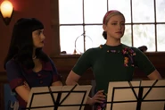 Elsewhere, Jughead types on his typewriter before leaving for school, expressing how he feels as though it's been longer than four years. Upon his arrival at school, Jughead joins Ethel, Ben, and Dilton in the lunchroom, whilst the River Vixens, comprised of Cheryl, Toni, and Midge, make their way through the hall as Bulldog practice is underway in the gym. The entire senior class then makes their way to the front of the school, where they collectively sing Monday, Senior Year, though this is merely a song sequence for Kevin and Clay's upcoming musical. For the first time ever, Principal Featherhead is open to doing an original musical this year as opposed to Oklahoma, and so Kevin and Clay decided to write a show about their lives at Riverdale High, but Featherhead needs to see a workshop presentation before agreeing. Archie questions why they're seniors in the show when they're juniors in real life. And Veronica wonders why she's still the new girl, whereas Julian feels as though he's being painted as a player despite being Archie's understudy. When Kevin explains that Archie is the main character, Cheryl and Toni inform him that they didn't come to be glorified chorus girls, though Kevin insists that everyone will get a solo line in the closing number, which he reveals will cover prom night, leading to both Jughead and Reggie quitting the production.