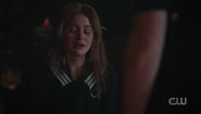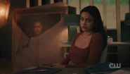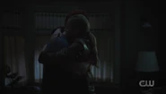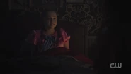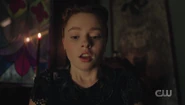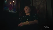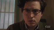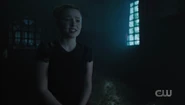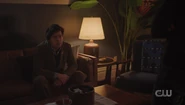 Betty arrives at Archie's with sunglasses on and shuts off the lights by the front door, asking Archie to turn off the TV as well as any other lights. She lost TBK in Maine, but her headaches have only gotten worse. She figured out that they're triggered by lights, meaning the brighter the light, the more excruciating the pain. It's a side effect of being able to see auras. She then hugs Archie, who tells her that Jughead can read minds and Percival Pickens can control people's minds.