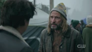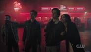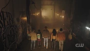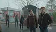 Moving forward with their plan to build micro houses, Jughead takes Archie, Frank, Tom, and Kevin to Sketch Alley, where he embraces Doc, who remarks that Jughead looks better than the last time he saw him. Jughead owes that to Doc, which is why they've come to build some houses for them. Archie tells them that they're welcome to help out, but he doesn't force them.