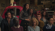 At the next town meeting, Veronica and Reggie give their proposal for the Babylonium. Instead of the town and casino being at odds, she proposes to the council that they work together to rebrand as a family friendly destination hotspot. When Alice sarcastically asks if children can gamble now, Veronica reveals her plans for an arcade and daycare. However, as Frank points out, Riverdale already has a lot of broken people, and a casino isn't a healthy environment for them. Alice agrees to look over the proposal, but in the meantime, if they have any trouble with the casino, then any partnership will be out of the question. Archie is up next with his proposal to build micro houses for the homeless, with the labor being provided free of charge by Andrews Construction. Toni is impressed with his proposal, with Tabitha adding that they have similar mini houses in Chicago, which are game changing. Archie wants to start with 30 houses. Unfortunately, it will cost approximately $20,00-25,000 to build each house, which Alice remarks they can't afford. Percival points out that his proposal will cost them nothing and can be carried out immediately, if approved. While Toni and Tabitha like Archie's proposal, they need funding and proof of concept.