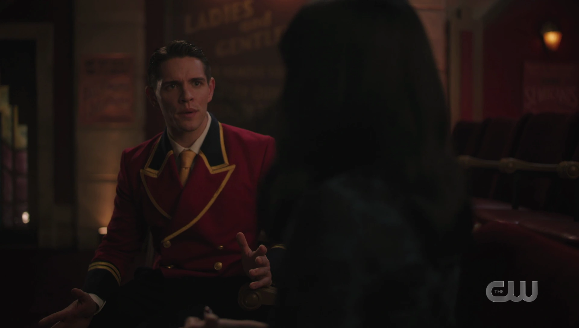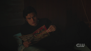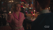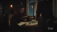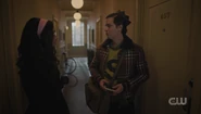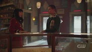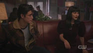 Jughead and Tabitha arrive at the Babylonium as planned. After making their way into the theater, Veronica tells Clay about how she and Jughead had a brief fling. She ended it because he's an odd ball. She prefers her men to be a bit more worldly, with an air of mystery about them. As Clay heads to the booth, Veronica touches his hand and tells him to think about picking up what she's putting down, which doesn't go unnoticed by Kevin.