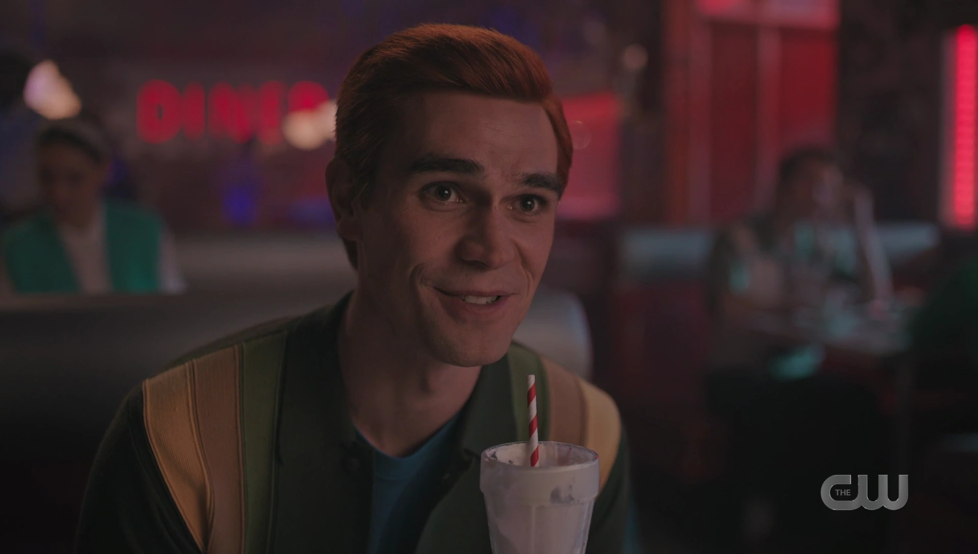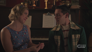 Archie and Cheryl discuss their upcoming marriage over milkshakes at Pop's. He questions if she really wants to go through with this. He welcomes the opportunity to get to know her better, and maybe even learn more about himself in the process. Cheryl recalls hearing that Archie wrote Veronica a love prom and asks if he can write her one as well.