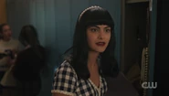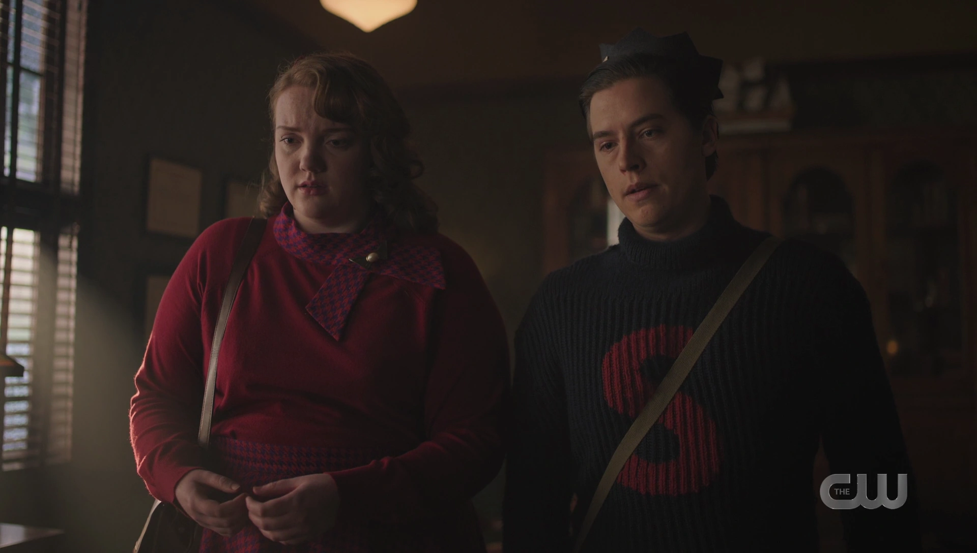 Veronica stops by the Sheriff Station to check on Jughead and Ethel, who are locked behind bars. They can be held legally for 24 hours. Veronica recalls that Jughead was at the dance the night of the murder. All they have to do is prove the time when the murder happened. That would at least clear Jughead, who could then find a way to exonerate Ethel. Putting on her Nora Charles hat, Veronica says that the coroner would've performed an autopsy on the Muggs and goes to find out exactly who that is. On her way out, Jughead tells Veronica that The Thin Man is one of his favorite films, in response to her Nora Charles reference