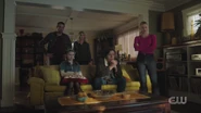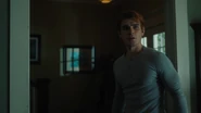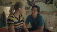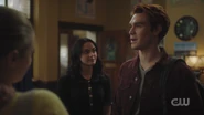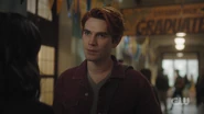 Archie joins his friends in the student lounge. Veronica greets him with a kiss and tells him to play along. Betty and Jughead ask where he has been. Archie explains that he’s been busy and that graduation hasn't been on his mind considering that he most likely won’t be graduating with them. Veronica then proceeds to guide Archie out into the hallway, where she explains that they must maintain the ruse of their relationship until after graduation. If people found out they broke up, then they’d be forced to either tell Jughead the truth about Archie and Betty or lie.