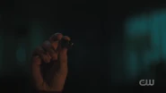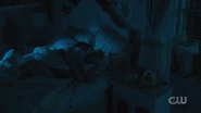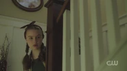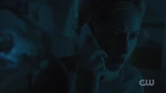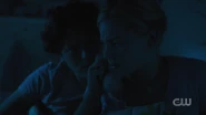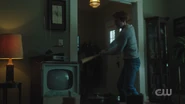Betty and Jughead find another tape from the Auteur sitting on the front porch. They join Jellybean, FP, and Alice in the living room, where they watch the latest tape together. The Auteur seemingly enters their house during the late hours of the night and softly caresses Jellybean’s face with a kitchen knife. Unnerved, Jughead quickly turns off the TV.