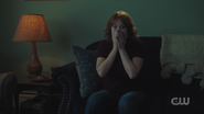 Archie returns home to find his mom watching the re-enactment videotape of the Black Hood holding Archie at gunpoint. Mary cries hysterically, as she had no idea ordeal Archie was subject to. Mary then reveals that she called Uncle Frank after learning that George Augustine came to see him. She pleads with Archie to talk to her, but he insists that he’s fine. Mary wants to send the tape to the sheriff or to Betty and Jughead at least. Instead, Archie breaks the videotape and smashes the TV with a baseball bat.