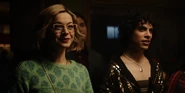 At the bar, Katy tells Prince Errol that it was very sweet how he talked Ginger off the ledge. He jokes that he’s used to giving queen’s advice. He asks if every night in the life of Katy Keene is this exciting. He can’t remember the last time he’s had this much fun. It’s difficult to cut loose when you’re in the public eye, he explains. Katy and Prince Errol then take to the dance floor with Pepper, Josie, Sierra, Ginger, and Luisa.
