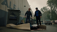 Archie and Reggie discover Dodger beaten and wrapped up in a carpet outside of the community center. Archie doesn’t hesitate and calls an ambulance.