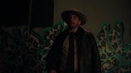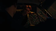 As the sun sets in Riverdale, Dodger’s minions go to work, committing numerous crimes, such as car parts theft. While disguised as the masked vigilante, Archie catches Eddie in the act of stealing from a car and handcuffs him to the steering wheel. Archie returns out of uniform and recruits Eddie. He brings him in, hoping to save him from Dodger and the streets with the help of FP and his mother, Mary. Archie arranges for Eddie to start working at Pop’s diner for Pop Tate and Veronica. He even serves Archie and Mary. Unbeknownst to them, Dodger watches from outside the diner.