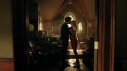 Charles has the derelict motel that the Farm is staying in under 24 hour surveillance. According to city records, it’s owned by one of Edgar’s followers, and they have photos of Evelyn answering the front door. The Farm has been getting pizza deliveries everyday at the same time. Charles has an agent in disguise about to make the delivery, which he and Betty listen in on through a wire the agent is wearing. Evelyn answers as the under cover agent knocks on the door. She immediately makes him. A scuffle can be heard before several rounds are fired off. Edgar finds the wire on the undercover agent’s body and taunts Charles.