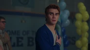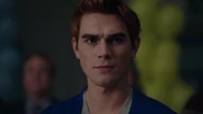 The next day, in Riverdale High's gymnasium, Archie prepares to be inaugurated. Mr. Weatherbee welcomes all those in attendance and asks that they rise for the National Anthem, sang by Josie. Archie looks up to the crowd, smiling at Veronica, Betty and Jughead. Sweet Pea, Fangs, Reggie, Moose, Cheryl, and Toni are all present for the inauguration. Archie's moment is brought to an abrupt stop as he notices Hiram standing at the end of the gym. Sheriff Minetta and two deputies enter through the opposite end of the gym moments later to arrest Archie for the murder of Shadow Lake resident, Cassidy Bullock. Realizing that he's being set up by Hiram, Archie insists that he didn't kill Cassidy, but the Sheriff doesn't care. He reads Archie his rights before tasking him into custody, leaving Jughead, Veronica and Betty, Sweet Pea, Fangs, Reggie, Moose, Cheryl and Toni shocked and horrified.