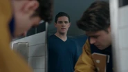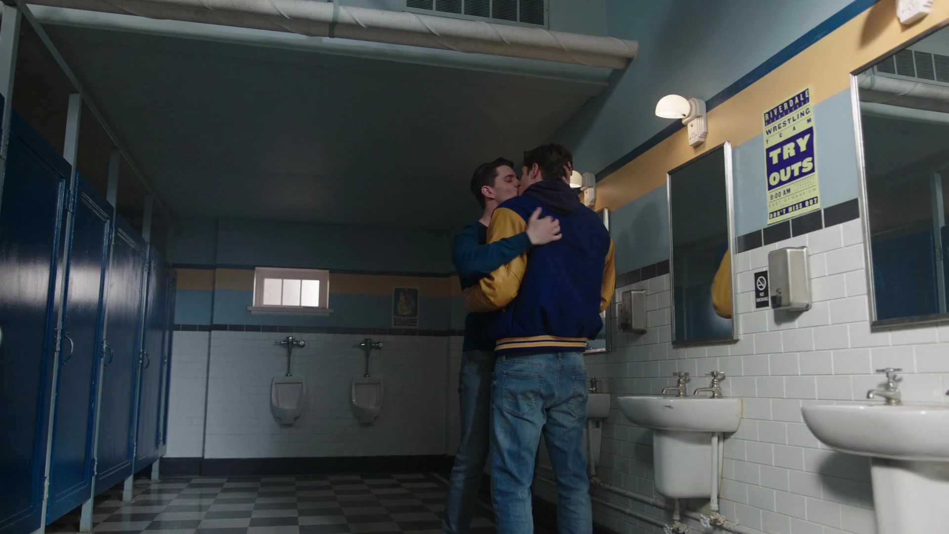 Kevin finds Moose in the bathroom crying. Moose wipes away his tears before revealing that all of Midge's belongings are gone. Midge's locker was trashed during the riots. All her books, stuffed animals and the notes that their classmates left her are gone. Kevin hugs Moose, hoping to console him as he reminds Moose that these are all material things and that he'll be alright. Moose then kisses Kevin, who is taken by surprise by this display of affection. Though hesitant, Kevin kisses Moose back and they proceed to make out in the restroom.