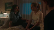 Polly returns to Riverdale with her twin babies Juniper and Dagwood. She questions why Betty and Alice haven't gone to see Hal yet. Betty claims that she's taking things one step at a time. Polly questions how they're supposed to forgive him if they don't go visit him. At the Farm, they taught Polly that forgiveness is the most valuable gift they can give. If they don't absolve him, they'll become what he was, full of hate. And Polly's babies deserve a mother who's better than that. Alice begins to think that Polly's right, at least about seeing Hal. Maybe that way they can get answers or Alice can give him a piece of her mind. Either way, Betty has no interest in seeing her father.