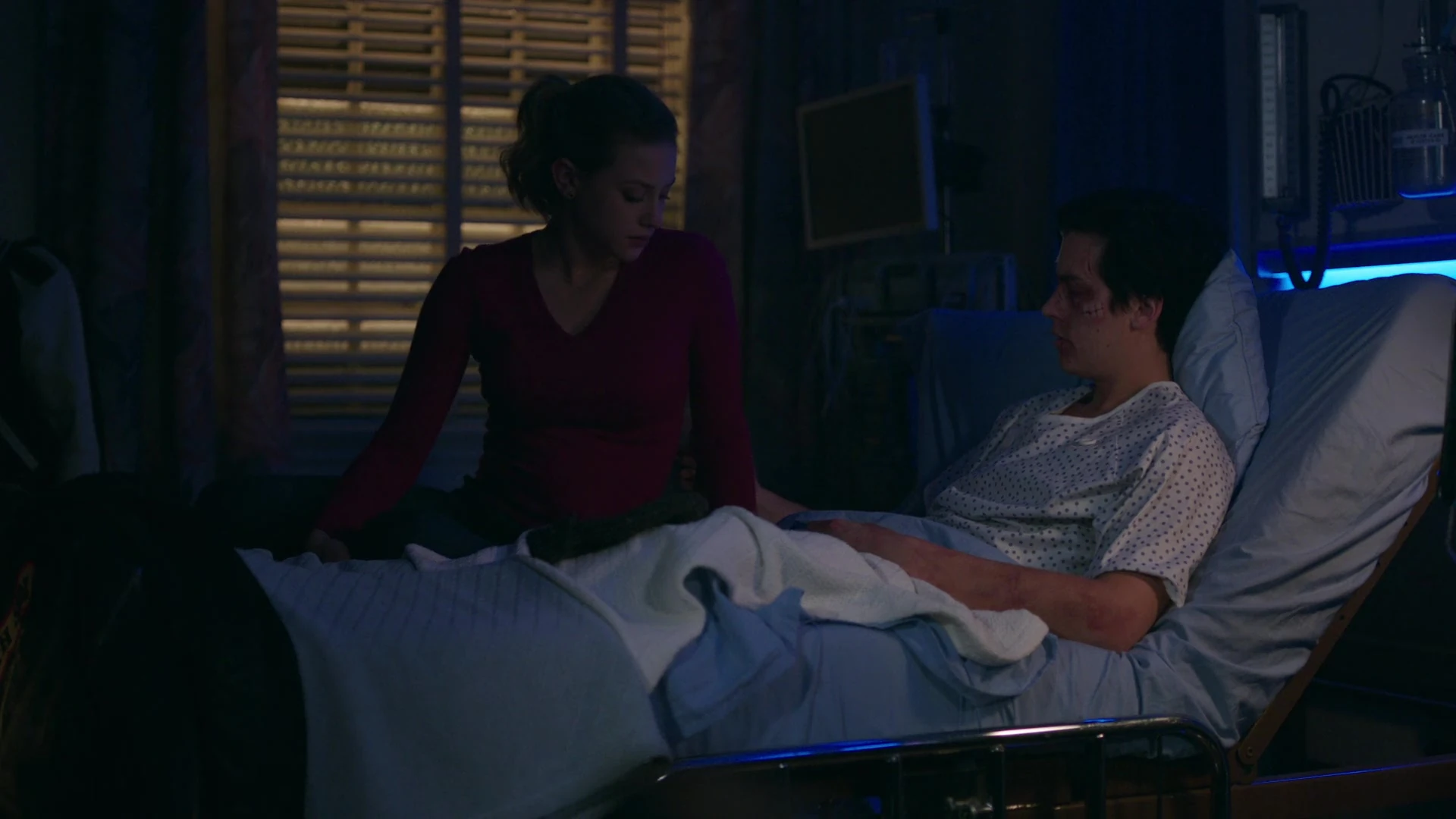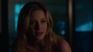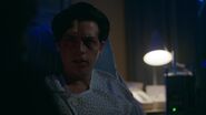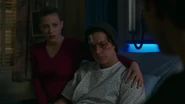Betty visits Jughead in the hospital after learning that he has awaken. Jughead now knows that her father was the Black Hood. He consoles Betty as she lays alongside him in his hospital bed. He's sorry that he wasn't there to see her through it. Betty tells him not to worry as she never wishes to see her father again. Her only concerns are Jughead, her mother and atoning for her father's sins. This means that she and Jughead are no longer running for student council. She then kisses him.