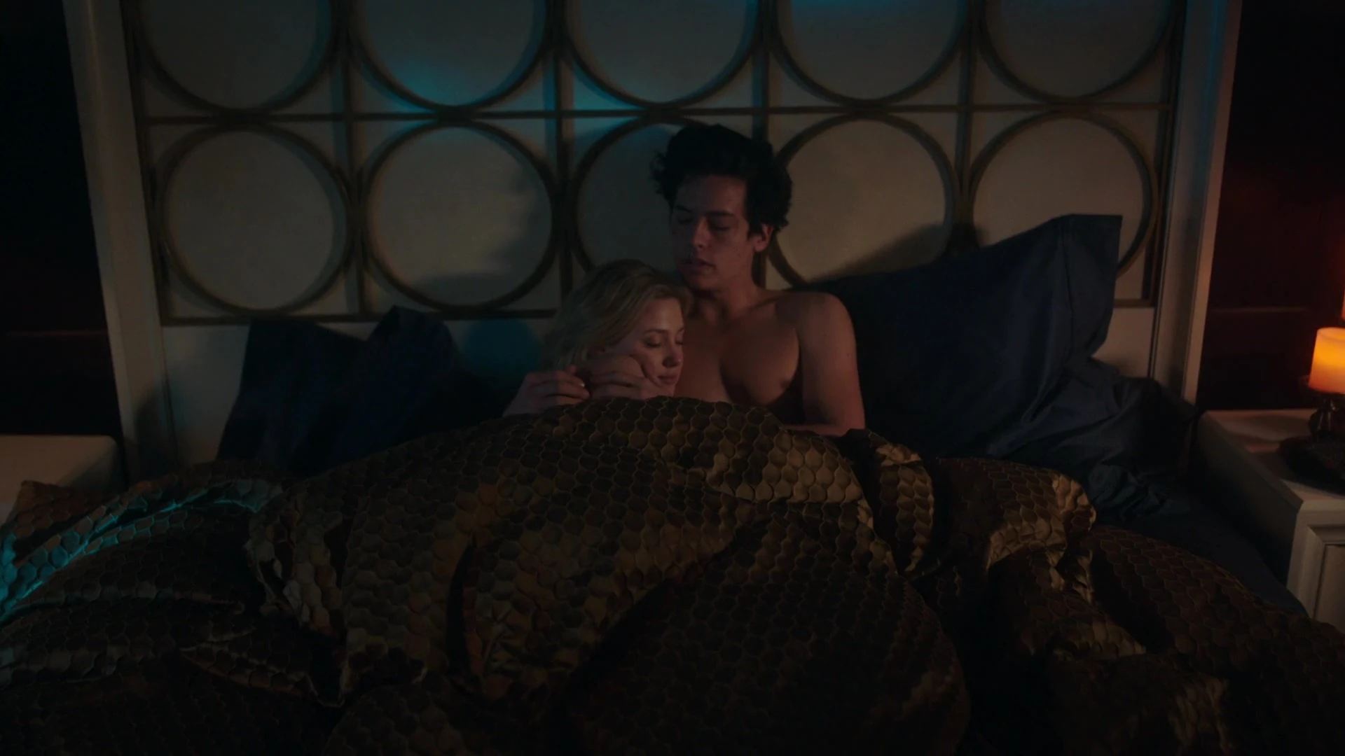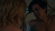 Later that night, Jughead books a room for himself and Betty at the Five Seasons. They lay in bed together unclothed. Betty wonders what's the special occasion. There is none, but Jughead feels that after everything that has happened, a night at the Five Seasons might be something that she would enjoy. He also wants to ask her to be the Serpent Queen to his Serpent King. He's essentially asking her to join the Southside Serpents, though he tells her that she doesn't have to give an immediate answer. He jokes that she can take her time and tell him tomorrow at lunch. They then proceed to have sex.
