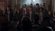 The asylum on the Northside that Jughead spoke of turns out to be the Andrews house, as Fred feeds the Serpents the following morning. FP enters the house, pleased with Jughead's determination to save the Serpents, so much so that he decides to hold off on leaving for Toledo given that the Bulldogs have gone out of their way in helping Serpents and Fred is even offering shelter. Jughead then thanks Archie for helping him. However, Archie isn't done there. He has an idea, asking Jughead how many Serpent jackets he can borrow. With that, the school comes together in a show support of the Southside students who are being wrongly transferred. Archie, Jughead, Josie, Veronica, Reggie, Cheryl, Toni, Sweet Pea, Moose, Kevin and many other students put on Serpent jackets and confront principal Weatherbee. Archie explains that everyone is ready to walk out. Mr. Weatherbee threatens to expel any student that does, though Archie calls his bluff. He knows that Weatherbee is a good man who doesn't discriminate, and if he isn't, Archie tells Weatherbee to expel him as he doesn't wish to be a part of that. With that being said, Weatherbee tells everyone to get to class.