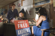 Over at the Andrews house, Fred hosts a party as they wait for the votes to come in for the mayoral election. Archie, Sierra, Veronica, Kevin, Moose, Reggie, and Josie all attend. Unfortunately, Fred loses the mayoral race to Hermione. Not long after this news breaks, Hermione stops by to tell Fred that he ran a great campaign. It was close. It came down to less than 200 votes. As a show of good sportsmanship, Hermione and Fred shake hands.