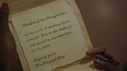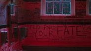 The festivities begin with an impromptu performance by the Fred Heads, normally just Fred and FP, but Alice, Sierra, and Hermione perform with them as Penelope, Marty, Daryl, Hiram and Tom watch. Eventually, Alice begins to feel out of place as she’s the only one not high off fizzle rocks. While the others are partying non-stop, she finds herself taken back. To make matters worse, she falls ill. Alice rushes to the restroom and throws up in the toilet. She exits the stall to find the chalices and the gryphon coin sitting on the restroom sink, and "flip for your fate" scribbled all along the walls. Alice exits the restroom, bypassing her friends only to be met by the Gargoyle King as she turns the corner. Struck with fear, Alice runs away, or so she tries. She doesn’t get far as Principal Featherhead enters the school, forcing her to hide. As he heads further down the hall, Alice takes the opportunity to make her escape. She spends the night calling the Midnight Club but no one picks up.