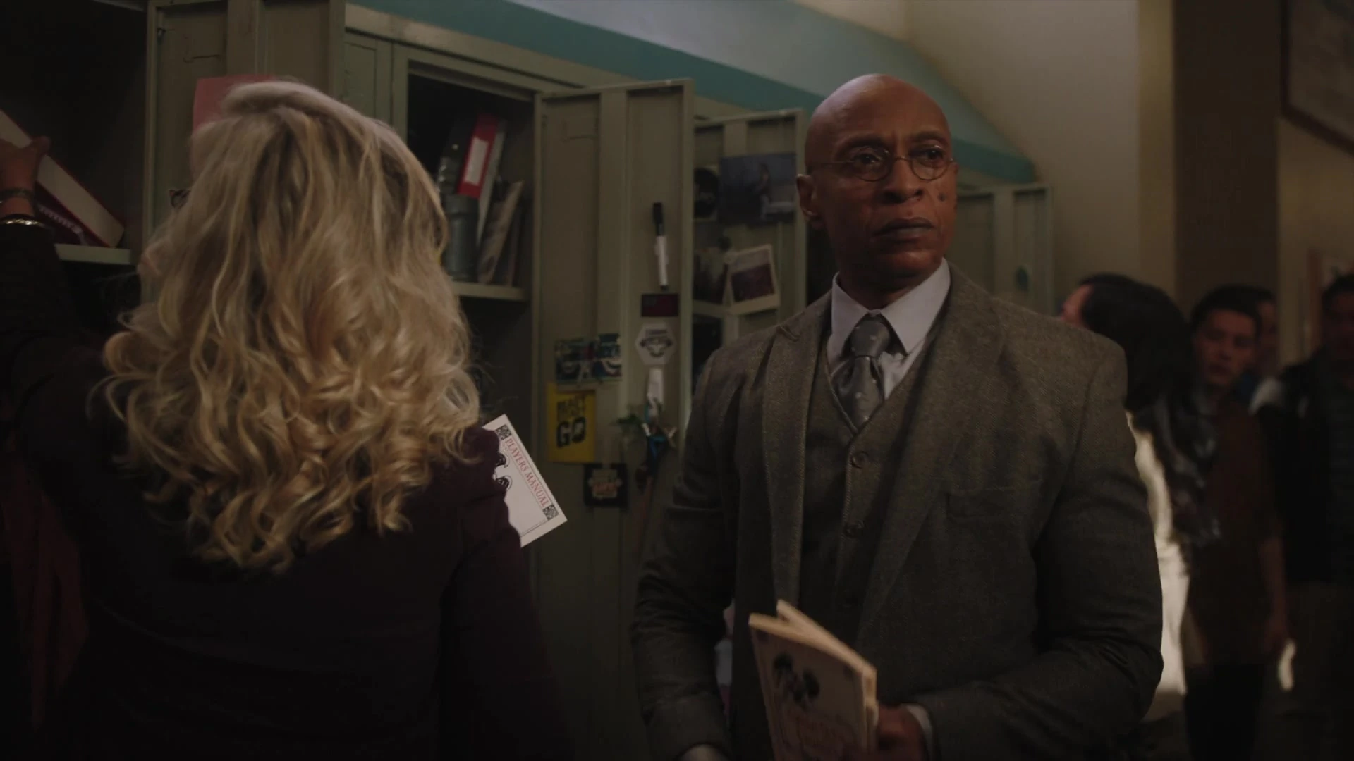Given the growing dangers that the teens of Riverdale are facing, the town Mayor, Hermione Lodge, decides to personally visit Riverdale High to provide clarity on the dangers they face. Jughead, Betty, Veronica, Cheryl, Reggie, Josie and Kevin are all in attendance. Hermione explains that two students, Dilton Doiley and Ben Button, have already taken their lives, and one other, Ethel Muggs, attempted to. All three victims are linked through playing Gryphons and Gargoyles. Jughead questions if Hermione is admitting that Ben and Dilton were killed by the game, which she is. Betty then asks where the game came from and where Ben and Dilton first gained access to it, but Hermione doesn’t know. From what little they do know about it, the game seems to be targeted at impressionable developing minds, to which Reggie replies "challenge accepted". Cheryl informs Hermione that some of them, such as herself, aren’t as impressionable as others. Hermione elaborates that the game’s quests and role-playing scenarios are specifically designed to foster delusions, paranoia, and violence. As mayor, Hermione officially bans Gryphons and Gargoyles. On top of that, Mrs. Burble is going to be holding extended office hours and Hermione has set up a 24-hour crisis hotline overseen by Kevin.