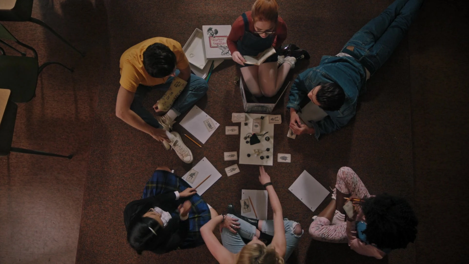 Alice, FP, Fred, Sierra, Hermione, and Penelope play for weeks, sneaking into school, late at night. After class, Sierra leaves the classroom window cracked so that she and the others can sneak back in after hours. They dub themselves "The Midnight Club". Eventually, they abandon the board, acting out their quests and adventures in the real world. The six of them dress up in medieval costumes they found in the theater department. It is during this time that FP and Alice begin a relationship, as does Fred and Hermione. As Alice, FP, Fred, Sierra, Hermione, and Penelope proceed throughout the halls of Riverdale High on their latest quest, they run into Hiram Lodge, Tom Keller, Marty Mantle, and Daryl Doiley, also playing Gryphons and Gargoyles. They have been for about a week. Daryl found it in the restricted section of the library. They decide to join forces and play a bigger game.