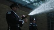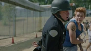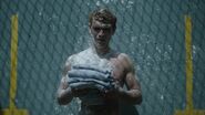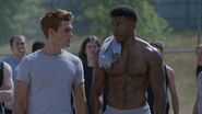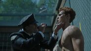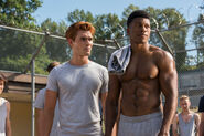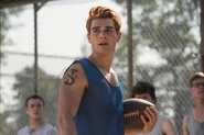 Archie's football game commences as planned. He's the running back. He doesn't make it far before being tackled on the ground. Just outside the fence, Veronica, Cheryl, Josie and the rest of the River Vixens cheer the boys on. As they perform, the boys storm the fence in excitement. The boys then return to the game as the girls continue to perform. During which time, Hiram arrives, much to Veronica's displeasure. Hiram informs her that the Warden is a friend and business associate. He told Hiram about the game and invited him to see it. Hiram refuses to watch as Hiram throws her life away for Archie. So, he has made arrangements that will prevent Veronica from visiting Archie anymore. Despite all of Hiram's effort, Veronica refuses to allow him to break her and Archie up. As the game is underway, Hiram signals Warden Norton, who then signals the guards to attack the players under the claim that they were rioting. Joaquin is one of the first to be knocked to the ground and beaten. Archie, on the other hand, fares better against the guards, taking out several of them before being overwhelmed and beaten as Veronica, Cheryl, Josie and the Vixens watch in horror.
