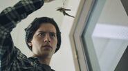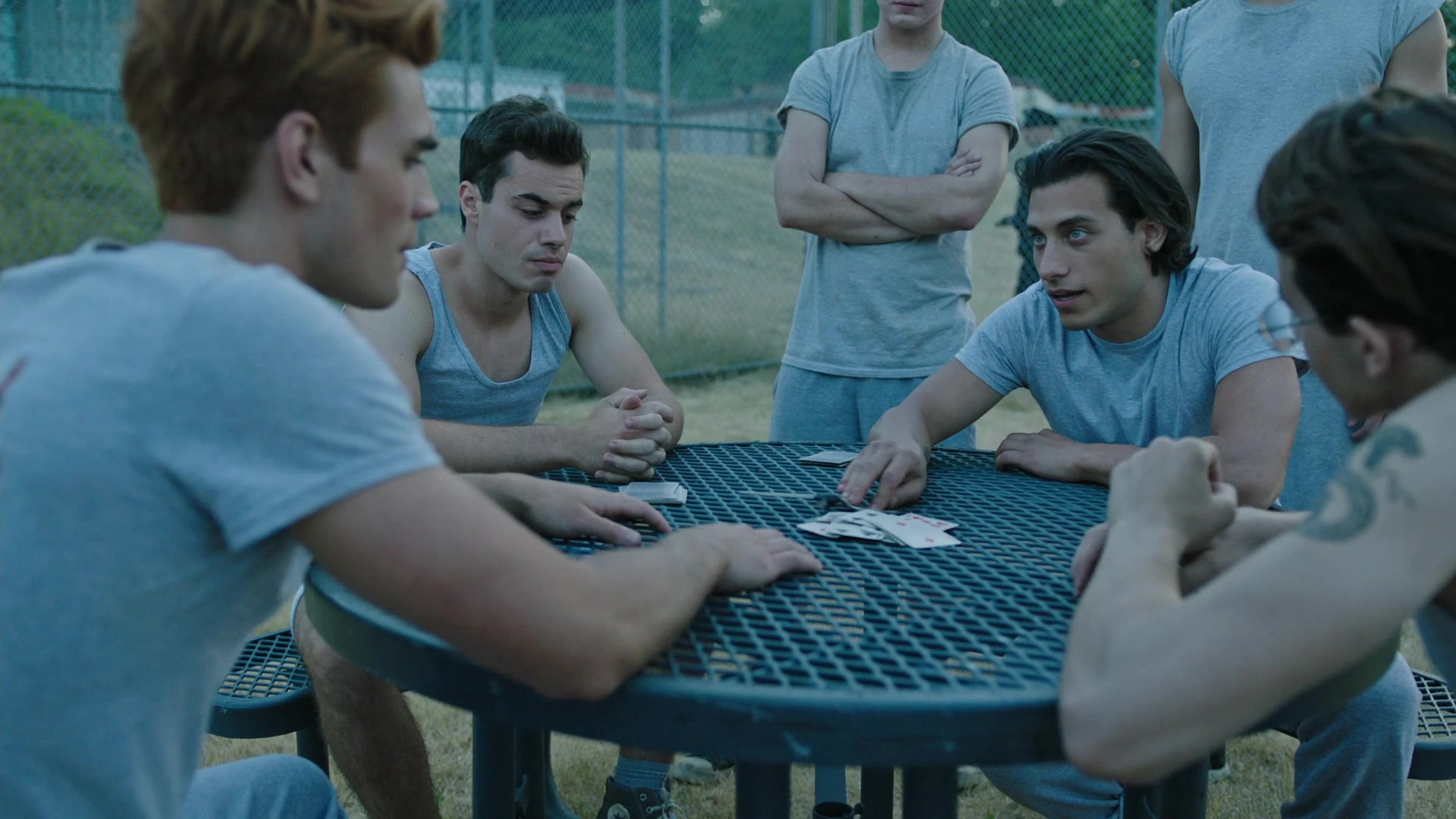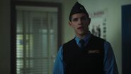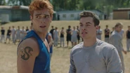 Archie enters the prison yard. All eyes are on him. Just as Jughead advised, Archie finds the Southside Serpents of the juvenile detention center. He asks to sit. It's only when he flashes his new Serpent tattoo that they allow him to. Slash, one of the Serpents, asks about Archie's tattoo, as it looks fresh. Archie tells him that it was done by FP Jones. Jughead made him a Serpent however and said that he could hang out with them. Little does Archie know, Joaquin is also locked up. He stuck around town after returning to help Fangs escape and got hauled in during riot night. Joaquin outs Archie to Slash and the other Serpents. And because of that, Archie has to earn their trust if he wants their protection. A test of loyalty. Joaquin pulls a shiv out of his shoe and hands it to Archie, telling him to stab the lone Ghoulie across the yard. No need to worry about the guards as the Serpents pay them to turn a blind eye. However, Archie refuses and walks off.