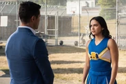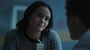 Despite her being put on the do not admit list for visitation, Veronica, with a fake ID from Reggie and a blonde wig, manages to fool the guards, claiming that her name is Monica Posh and that she is with Riverdale's chapter of the Innocence Project and that she will be working to get Archie released.