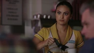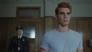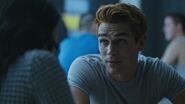 Fred joins FP and Tom at Pop's Chock'lit Shoppe after getting off the phone with Warden Norton. Veronica, who is working behind the counter, is relieved to hear that Archie has gone through processing and that he is fine. In other developments, Fred got a line on the three thugs that gave false testimonies against Archie. Tom is friends with the Sheriff over in Shadow county. They found remains of a campfire in the deep woods. Veronica is disgusted with the fact that while Archie's in jail those who gave a false testimony are camping. Not for long, FP replies. Until Archie's release, Veronica intends to keep everything in order at Riverdale High so that everyone knows he'll be back in time for Homecoming.