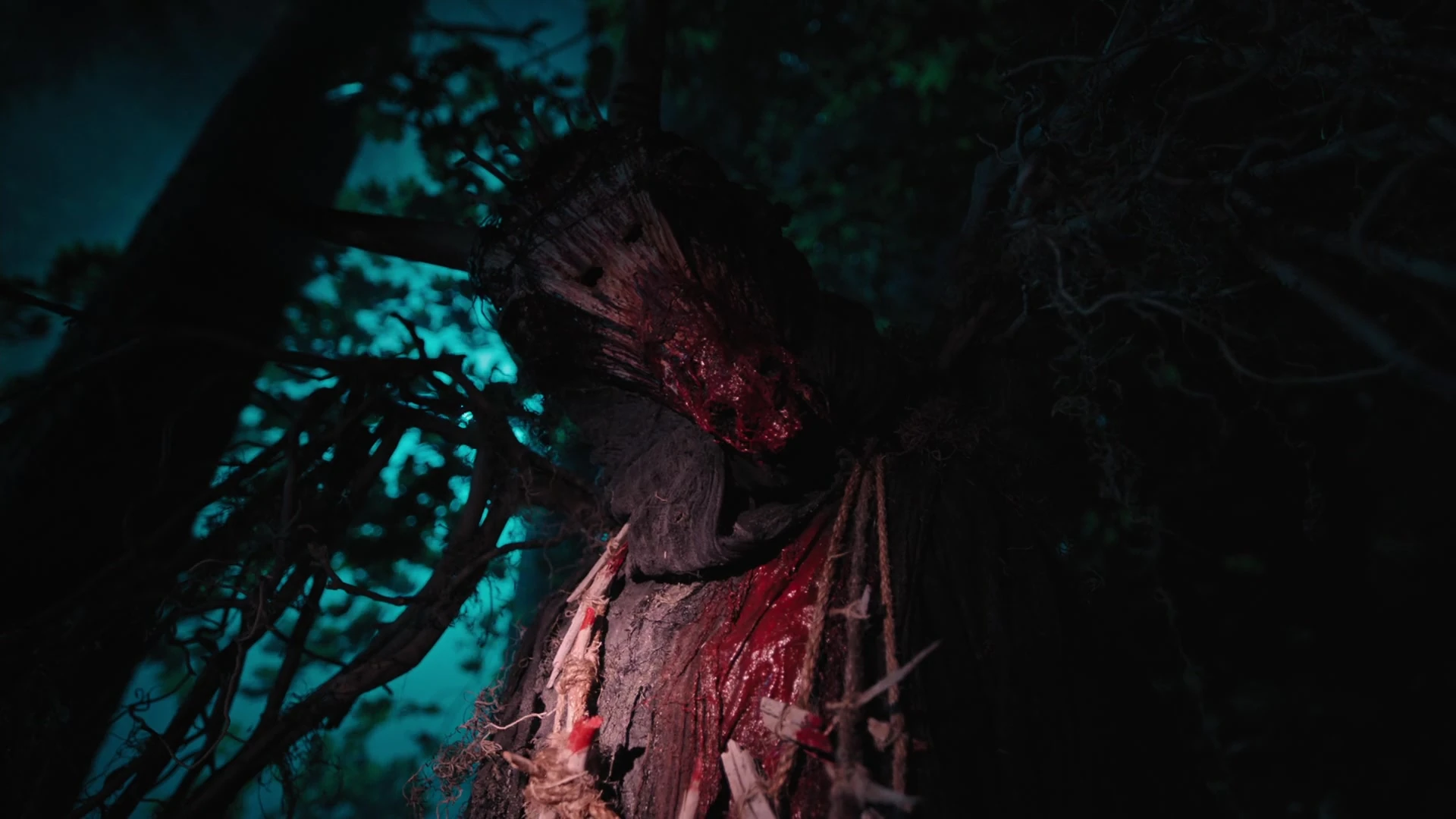 On their way to Fox Footbridge to meet with Ethel, Jughead asks about the seizure. One moment Betty was fine and the next she was hallucinating some insane, horror movie-like stuff. Then she woke up in the emergency room, embarrassed, which is why she didn't say anything. Besides, Dr. Patel said it was just stress. Jughead now blames himself for getting Betty involved in a murder investigation in the midst of her own problems. However, being in the middle of the woods with Jughead, investigation a potential murder/suicide is the least stressful thing she can think of. It reminds her of when they first started dating. As they near Fox Footbridge, Betty and Jughead have their first encounter with the Gargoyle King, a giant imposing creature with a bloody, snout-shaped face and branches for wings. Betty and Jughead run away in terror.