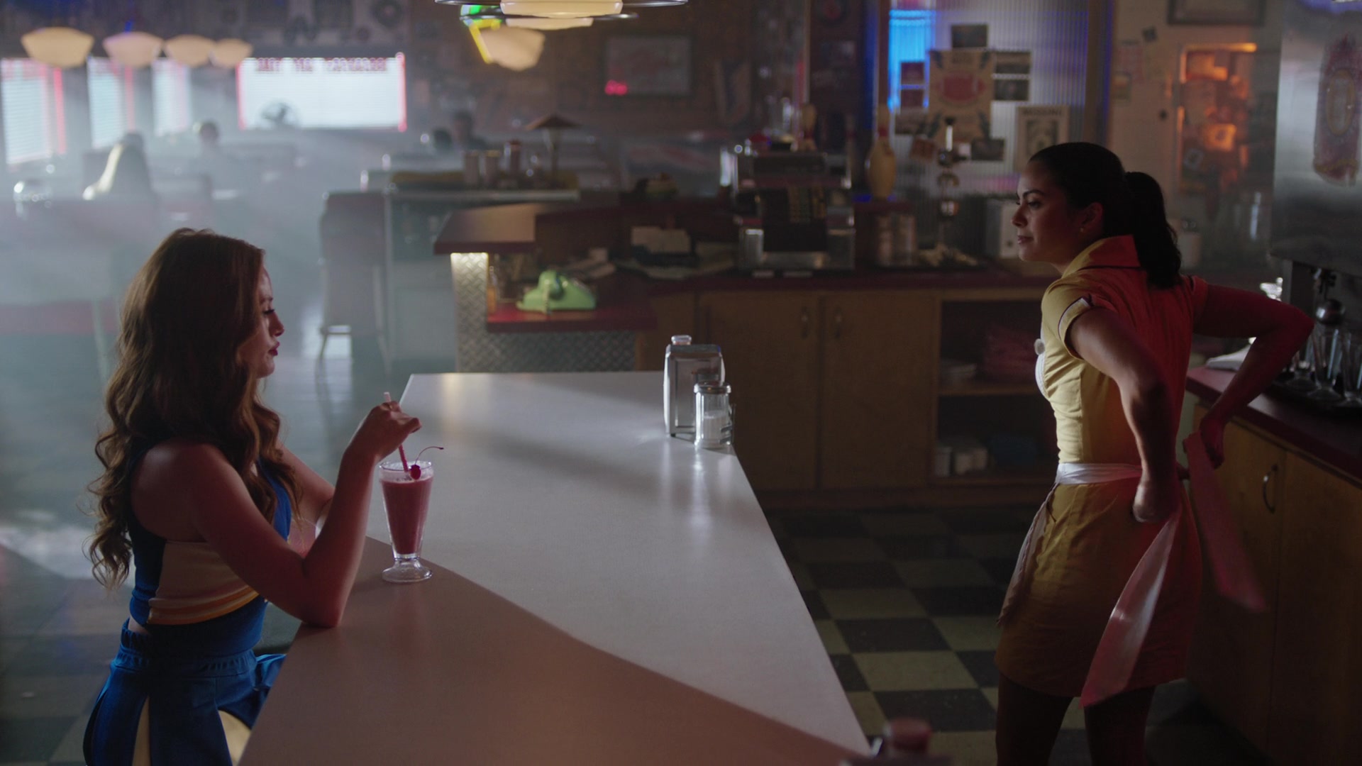 Veronica and Cheryl return to Pop's, where they discuss the lengths at which Hiram is willing to go to break her and Archie up. She can't even visit Archie anymore after her name was put on a do not admit list. Cheryl advises Veronica to get a new name. Before leaving on her iconic road trip to California with Toni, Reggie got them fake IDs, so they could get into the Viper Room. Cheryl's certain that he could hook Veronica up, too.