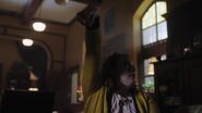 As Archie's girlfriend and former running mate, Veronica approaches Mr. Weatherbee to make him aware that she'll be stepping in as interim student body president. Unfortunately for Veronica, Cheryl has already petitioned to be president. Veronica confronts Cheryl in the girls locker room for trying to steal Archie's presidency. Cheryl replies by asking who would Veronica have lead them through the super dark times of junior year, someone like Ethel Muggs, who Cheryl had bypassed earlier as she was going on about a winged creature that was after her. Veronica answers that she intended to keep Archie's seat warm until his return. Cheryl questions why, comparing their dilemma to that of John F. Kennedy's assassination and Lyndon B. Johnson's rise to presidency. However, as Josie points out, Johnson led them to Vietnam. Josie then suggests that Cheryl give Veronica a break all things considering, but Cheryl is only willing to a point as she reveals that she needs the presidency for her college applications.