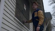 The following morning, Archie joins Fred in the kitchen after a rough night of sleep. Archie can't stop thinking about the Black Hood's message that said all those who escaped him before will die. Archie suggests that his father leave town and stay in Chicago with his mom. This of course would leave Archie all alone. Which just will not do for Fred. He informs Archie that Sheriff Keller put a deputy outside their house. But that won't be nearly enough to stop the Black Hood considering that he killed Midge in an auditorium full of people.