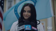 Just outside the Mayor's office, everyone in town watches as the Lodges hold a press conference to announce that Hermione will be running for Mayor. Hermione goes on to give a brief campaign speech as the crowd applauded. "Thank you, Veronica, and thank you all very much. Like many of you, I grew up in this town dreaming of a better tomorrow. For myself, for my family and for my friends. And now, for the future that you all so deserve. Riverdale is one of the most dynamic, resilient communities. {...} Riverdale cannot succeed unless all of us succeed and that will require certain sacrifices. {...} We will also need your support. We will need your trust. We will need your loyalty. {...} This town has endured so much these past few years. After so much adversity, aren't we all ready for a taste of prosperity?" And there it is. The Lodges have won. Leaving Jughead to wonder what will follow for Riverdale.
