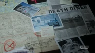 At school, Archie asks Jughead if he is still in pursuit of Hiram Lodge, which he is. Archie tells Jughead of the special election to replace Josie's mother, and how Hiram wants his dad to run. But Archie doesn't want his father any deeper with the Lodges than he already is. And while Archie can't tell him not to run as that would come with consequences, Jughead can however intervene. So Archie offers Jughead information in hopes that he will write an article about it, forcing his dad to abstain from the election. Archie reveals that Hiram Lodge secretly bought Pop's Chock'lit Shoppe from Pop Tate. Jughead pulleds out his map, looking at the territory claimed by the Lodges. He compares Hiram to Dracula and accuses him of snapping up all of Riverdale in order to expand his empire and feed.